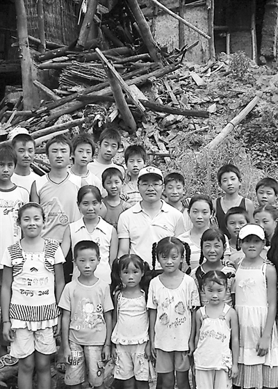龚学明(中间戴帽者)在四川省青川县实地考察贫困学子时与孩子们合影(2008年7月15日摄)。