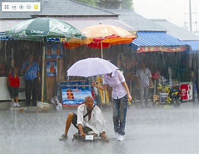 最美女孩——8月18日,苏州,大雨如注人人避雨,但一位女孩却走进雨中,为残疾乞丐撑起一把伞。