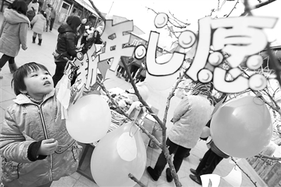 1月1日,一位小朋友将祝福卡片挂在树枝上祈福。当日,在北京市朝阳区皮村,来自各行各业的外来务工人员在社区文化活动中心欢庆新年。