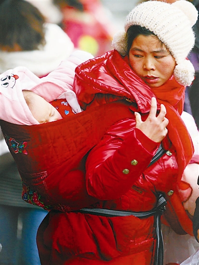 2012年1月3日,江苏省南京市,随着春节的临近,跟随父母在异乡生活的孩子们像候鸟一般,开始陆续返回故乡。虽然回家的路途辛苦,但父母温暖的怀抱让回家路充满了幸福的滋味。王新 摄