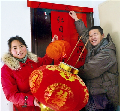 2011年12月30日,在江苏省连云港市新浦区非公经济项目区务工的刘士强、李永花夫妻俩正在廉租房里贴对联、悬挂红灯笼。近年来,新浦区工商分局推进廉租住房保障工作,像刘士强、李永花夫妻俩一样,今年元旦、春节期间,在新浦区非公经济项目区有260户外来农民工住进每月每平方米租金2元的廉租房。张玲 钱梅 摄