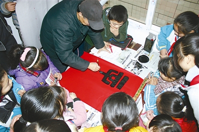 2011年12月30日下午,贵州省文化馆老师在俊英小学义务为农民工子女上书法课。