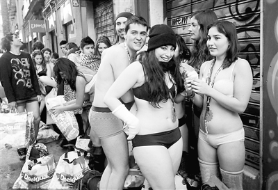 1月2日在西班牙马德里,冬季购物第一天,仅穿着内衣的购物者排队进入Desigual专卖店。在名为“全裸进入,盛装离开”的促销活动期间,只穿着内衣的前100名顾客可以进入商店,免费挑选衣服。阿健 供图