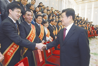 1月5日,全国工会送温暖活动开展20周年、困难职工帮扶中心建设10周年座谈会在北京人民大会堂举行。会前,中共中央政治局委员、全国人大常委会副委员长、中华全国总工会主席王兆国接见与会代表。本报记者 杨登峰 摄