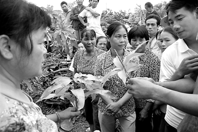2009年7月13日,在广西百色市总工会举办“农民工培训”活动现场,返乡农民工学习种植技术。