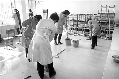 2010年1月14日,黑龙江伊春市家政服务培训班,家政服务人员学习地板打蜡养护。