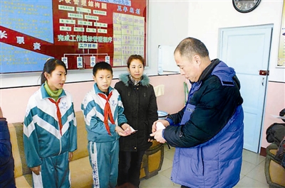 新加坡华人李先生连续3年资助4名小学生并承诺资助到高中毕业(图为鹤岗市总工会困难职工帮扶中心工作人员代转交资助金)