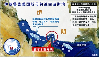 面对伊朗的“豪言”,美国警告伊朗不要试图封锁霍尔木兹海峡。美国防部发言人乔治·利特尔28日说,霍尔木兹海峡不仅关乎地区安全与稳定,同时也是包括伊朗在内的海湾国家的重要经济生命线。任何企图干扰霍尔木兹海峡交通运输的做法都是不能容忍的。同天,驻扎在巴林的美国海军第五舰队新闻发言人也表示,霍尔木兹海峡的商品流动对当地及全球繁荣极为重要,“美国海军已做好准备回击险恶举动,确保航行自由”。29日,美国斯坦尼斯号航母和“莫比尔湾”号导弹巡洋舰“常规”穿越霍尔木兹海峡,在穿越过程中未与伊朗海军发生摩擦。