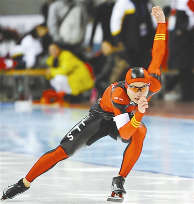 1月5日,在速度滑冰男子全能500米比赛中,吉林市队张宏亮以36秒88的成绩列第一位。