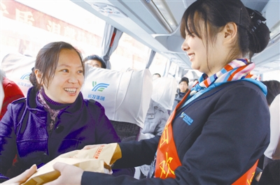 路上,客车服务人员还为旅客送上由工会组织派发的爱心食品包裹,牛角面包、香肠、话梅、矿泉水、晕车药……一应俱全。19岁的王树打开爱心包笑得合不拢嘴,“有吃,有喝,有软座,一路睡觉回到家,春节回家,太舒坦了。”