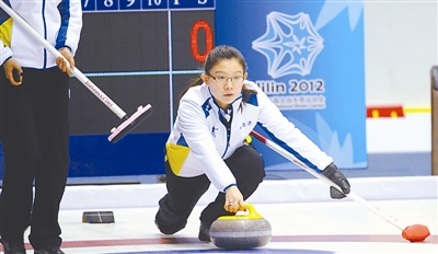 1月8日,第12届全国冬季运动会冰壶比赛中,拥有四名冰壶“国手”的哈尔滨女子冰壶队一场未输,成功卫冕,获得金牌。图为哈尔滨的王冰玉正在投掷冰壶。本报记者 许之丰 摄