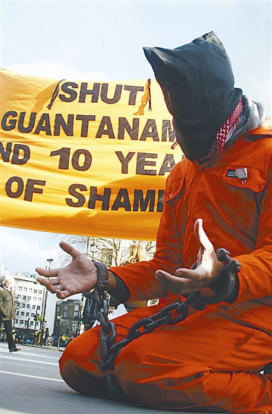 1月7日,在英国首都伦敦,打扮成关塔那摩监狱囚犯的抗议者展示镣铐。2002年1月,美军在位于古巴的关塔那摩军事基地内建立了一所监狱,将抓获的大批“基地”组织和塔利班成员关押于此。随着美军一系列虐囚事件曝光,关塔那摩监狱的恶劣状况受到国际社会的广泛关注。新华社发 (高塔姆 摄)