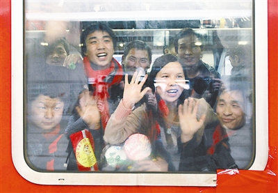 图为在北京西站,即将返乡的农民工向送行的人挥手告别 。本报记者 杨登峰 摄