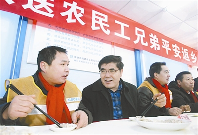 图为中华全国总工会副主席、书记处第一书记王玉普与农民工一起吃饺子,为他们送行。本报记者 杨登峰摄