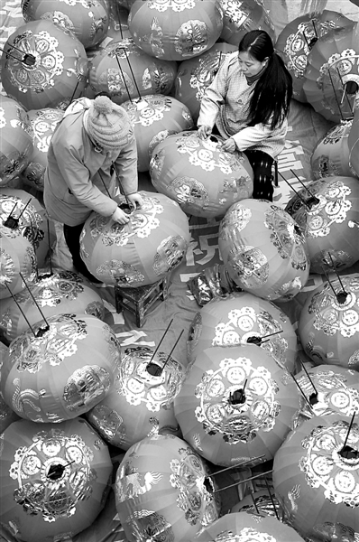 龙年春节临近,吉祥喜庆的大红灯笼日益走俏。图为1月9日,河南省温县北冷乡许北张村农民正在加紧赶制销往郑州市场的灯笼,灯笼作坊内外洋溢着浓浓的年味。 徐宏星 摄
