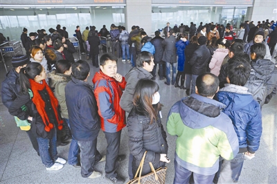 1月11日,银川火车站售票厅退票窗口排起长龙。
