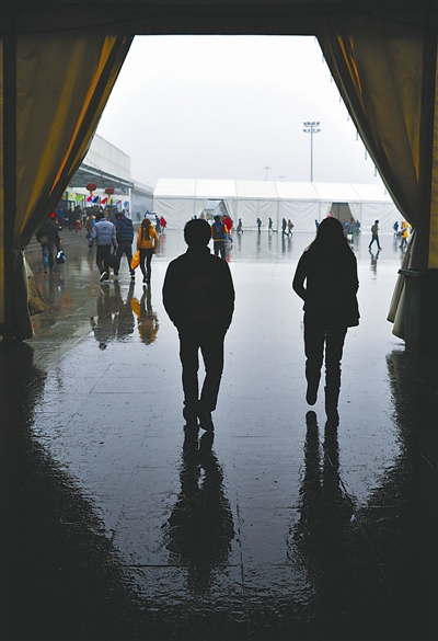 1月10日,几名旅客走出贵阳市金阳客车站的临时候车帐篷。当日是2012年春运第三天,拥有大量外出务工农民工的贵州省迎来务工流高峰。据了解,贵州省常年外出务工人数约为500万人。新华社记者 刘续 摄