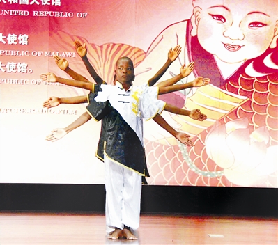 1月10日,在马拉维首都利隆圭,马拉维儿童艺术团演员表演中国舞蹈《千手观音》。