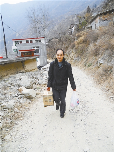 1月12日15时,王明成走在村里通往家的路上。这是2000多公里旅程中的最后一段。 本报记者 邓崎凡摄
