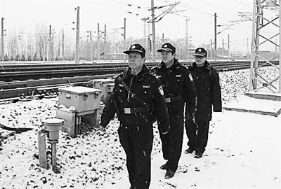 大同铁路公安处茶坞车站派出所为确保大秦铁路运输通道畅通,确定了重点区段、部位,全天候上线巡视。为了克服线长点多的困难,茶坞所自筹资金在远离派出所的线路区间设置看守点,做好安全保卫工作。高永生 摄