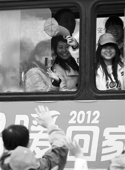 1月15日,在广东东莞凤岗镇体育广场,返乡旅客在“爱心大巴”上向送别的人们挥手告别。当日,由东莞凤岗镇政府出资主办的“2012温暖回家路——关注新莞人春节返乡大型公益暖流行动”正式启动。1000余名在东莞打工的旅客将免费乘坐政府安排的“爱心大巴”或“爱心专列”返乡。 新华社发