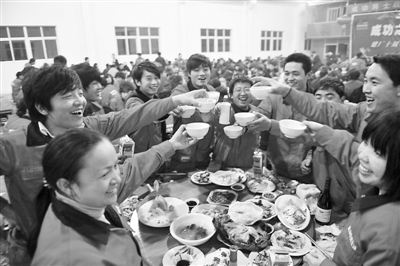 1月14日晚,在浙江省舟山市普陀区成功之路汽车修理厂内,洋溢着喜庆的氛围,由该厂举办的外来员工年夜饭正在这里举行。当晚,该厂100多位外来员工围坐在圆桌旁,欢欢喜喜地吃着企业为他们安排的年夜饭。据了解,这些外来员工来自安徽、河南、江西等10个省份,今年不回家过春节。胡社友 摄