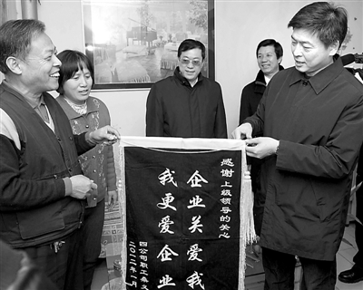 “去年我老伴出了车祸,在床上整整躺了一年,医疗费花了不少。我又退养在家,不能为公司发展做贡献,但是公司还能想到我,我觉得特别感动。”近日,中铁十八局集团四公司退养职工桑义杰,对前来送温暖的集团公司董事长、党委书记郝趁义(右)等领导一边说着感谢的话,一边送上写有“企业关爱我,我更爱企业”的锦旗。王会堂 彭婧摄