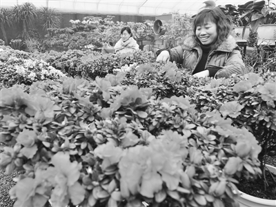 1月19日,山东邹平县好生镇花卉培育基地的花农在护理杜鹃花。