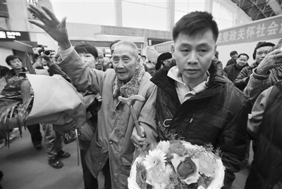 1月19日,南宁,老英雄刘世尧老人在儿子的陪同下走出南宁国际机场,挥手与亲人见面。当日,远征军刘世尧老英雄在一批志愿者的帮助下,从泰国回到了家乡。