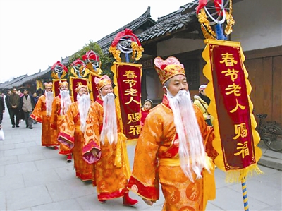 春节老人赐福春节期间,由身体康健的老人,装扮成春节老人迎着鞭炮声在锣鼓声中游春,给小孩子发压岁钱,寓意赐福。