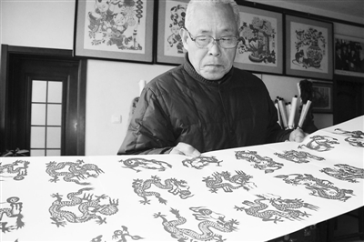 为迎接农历龙年的到来,山东博兴县锦秋街道民间剪纸艺人耿延祯用时2个多月创作完成了剪纸作品《百龙图》。《百龙图》取自龙腾飞的50种不同姿态,每种姿态成对剪裁,寓意“百龙呈祥”,作品刻画细致、剪裁精美。图为耿延祯在展示《百龙图》。陈彬 摄