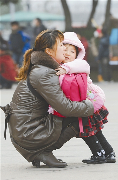 在该站广场,一名小朋友依依不舍地与母亲告别 。新华社记者 陈诚 摄
