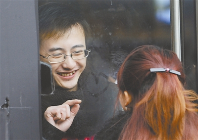 重庆火车北站候车室内,一对情侣隔着玻璃用“心”字告别 。