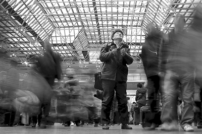 一位旅客拿着车票在火车站查看列车信息。回不回家过年,让一些人感到纠结。杨登峰 摄