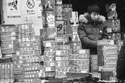 山东聊城,市民在育新街某露天销售点选购鞭炮。 孔晓政 摄