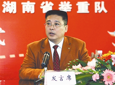 图为2010年12月,梁小东在湖南省举重队一次会议上的资料照片。新华社发