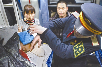 1月28日晚,在上海开往郑州的K152次列车上,一位5岁男孩高烧不止,列车长紧急联系医生救治。一位来自河南省肿瘤医院的医务工作者随即来到小男孩身边。