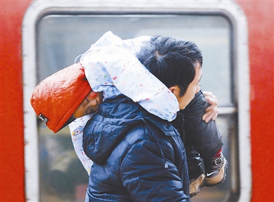 1月28日,在江西九江火车站站台,一位父亲背着熟睡的孩子准备上车。