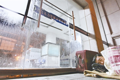 1月29日晚,浙江义乌人力资源市场门口,不少前来找工作的外来务工者打起了地铺,准备等待一个好机会。据了解,一些外来务工者年初三就来到这里找工作了。为了省钱、不错失良机,他们24小时在此守候。