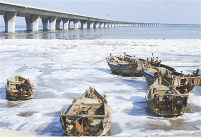 2月2日,青岛胶州湾大桥大沽河航道桥附近,部分停泊海岸的渔船被海冰所困。