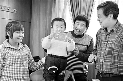 1月16日,浙江丽水云和县雾溪乡宋世堂一家,来到温州龙湾供电分局,感谢四年前的救命之恩。2008年丽水遭遇冰灾,龙湾供电职工冒冰雪把宋世堂早产的妻子送下山就医。为了感恩,宋世堂为孩子取名宋光明,让儿子记住这群来自温州的光明使者。(叶珊 摄)