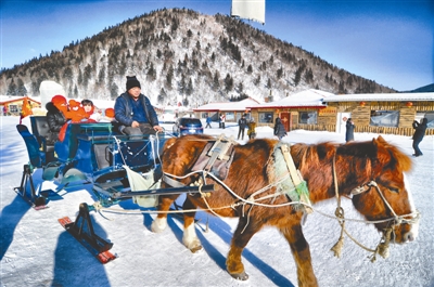 2月3日,在黑龙江大海林林业局双峰林场景区,游客乘坐马爬犁游览。近年来,双峰林场景区依靠独有的原生态冰雪旅游资源,积极倡导低碳旅游方式。景区在严禁采伐树木的同时,还实施了社会车辆禁止出入核心景区、禁止燃放烟花等多项措施,有效保护了原生态冰雪资源,将每年的旅游期由过去的2个月延长至3个月左右,吸引众多游客前来体验冰雪乐趣。新华社发 (张春祥 摄)