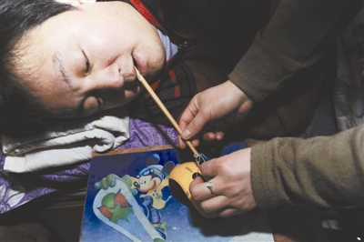 图为丁志叼着朱春秋给他做的“特制筷子”操作鼠标上网。新华社记者 王松 摄
