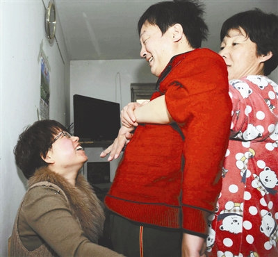 图为朱春秋(左)与保姆(右)合力将丁志扶起。新华社记者 王松 摄