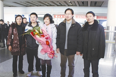 本报讯 2月5日上午,刚刚获得直布罗陀国际象棋公开赛亚军的中国棋手侯逸凡(中)乘机抵达北京。国家队总教练叶江川与侯逸凡的父亲等到机场迎接。王梦洁 摄影报道