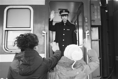 2月6日,正月十五元宵节,内蒙古通辽火车站,由通辽开往大连的K7630次旅客列车准时启动,列车长李旭辉与家人挥手再见。当日,李旭辉6岁的女儿与妻子专程来到站台为他送行。宫文波 摄