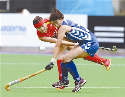 2月5日,在阿根廷罗萨里奥进行的2012年女子曲棍球冠军杯的比赛中,中国队经过点球大战以5比6负于韩国队,最后仅获得第八名。图为中国队球员德娇娇(左)与韩国队球员韩英在比赛中争抢。新华社发