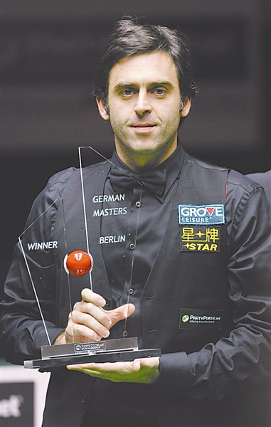 2月5日,英格兰选手奥沙利文举起德国大师赛冠军奖杯。