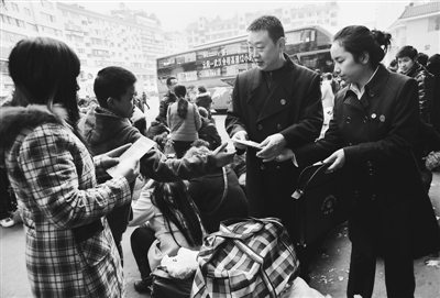 2月1日,重庆市云阳县法院的法官来到车站、码头,向外出务工人员免费发放普法资料,现场解答农民工的法律问题。云阳是三峡库区劳务大县,每年有近40万人在外务工,春节过后,当地法院的法官主动深入到农民工出行相对集中的车站、码头,向外出务工人员宣传法律、进行诉讼指导,并留下多种联系方式,建立一条直通家乡的“农民工维权便捷道”。饶国君 摄