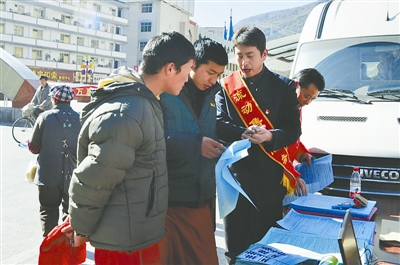 2月4日,成都铁路局派出移动售票服务车首次开进四川甘孜藏族自治州首府康定,并现场向当地群众宣传安全乘车知识,并代售火车票。本报记者 高柱 本报通讯员 田小川 摄